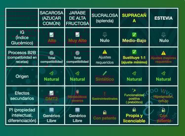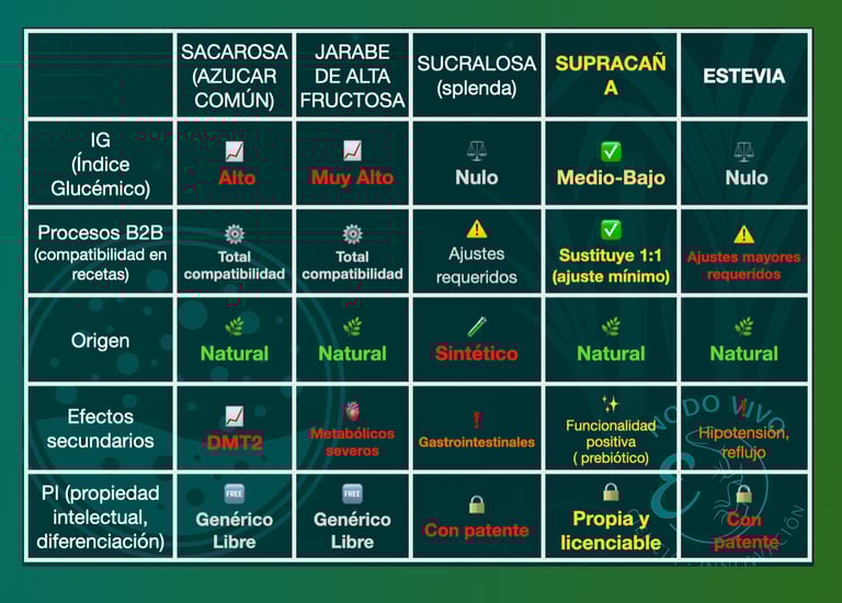 Analizamos las principales opciones del mercado en términos de salud, funcionalidad y compatibilidad industrial. SupraCaña destaca por su equilibrio único entre rendimiento técnico y beneficios metabólicos.